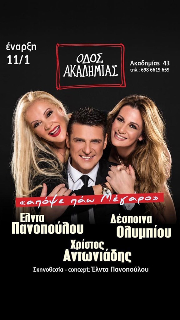 Η μουσική σκηνή «Οδός Ακαδημίας» παρουσιάζει ένα μουσικό show γεμάτο χιούμορ, τραγούδι, χορό, έρωτα, γέλιο, νοσταλγία, καλό ελληνικό τραγούδι και πολύ κέφι με τίτλο: «Απόψε πάω Μέγαρο…»