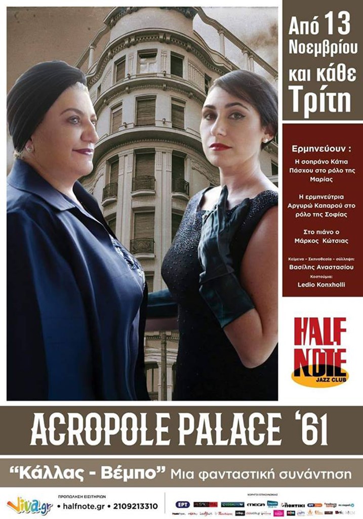 Η συνάντηση διαδραματίζεται μια νύχτα του 1961 στο μπαρ – φουαγιέ, του ξενοδοχείου «Ακροπόλ Παλλάς», το οποίο ως κτήριο υπάρχει ακόμα, στη συμβολή των οδών Πατησίων και Στουρνάρη. Εκεί καταφεύγουν οι δύο ερμηνεύτριες, μια και δεν τις αφήνουν να κατευθυνθούν προς τα σπίτια τους, λόγω μιας διαδήλωσης…τα υπόλοιπα νομίζω είναι καλό, να τα ανακαλύψει κανείς ως θεατής-ακροατής, στην παράσταση μας.