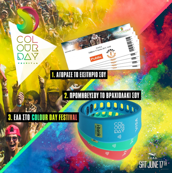 Εισιτήρια θα προμηθευτείς από τα καταστήματα Public και ηλεκτρονικά στο www.public.gr και www.ticketservices.gr. Δες εδώ πώς θα προμηθευτείς το ειδικό βραχιόλι εισόδου του ColourDayFestival.