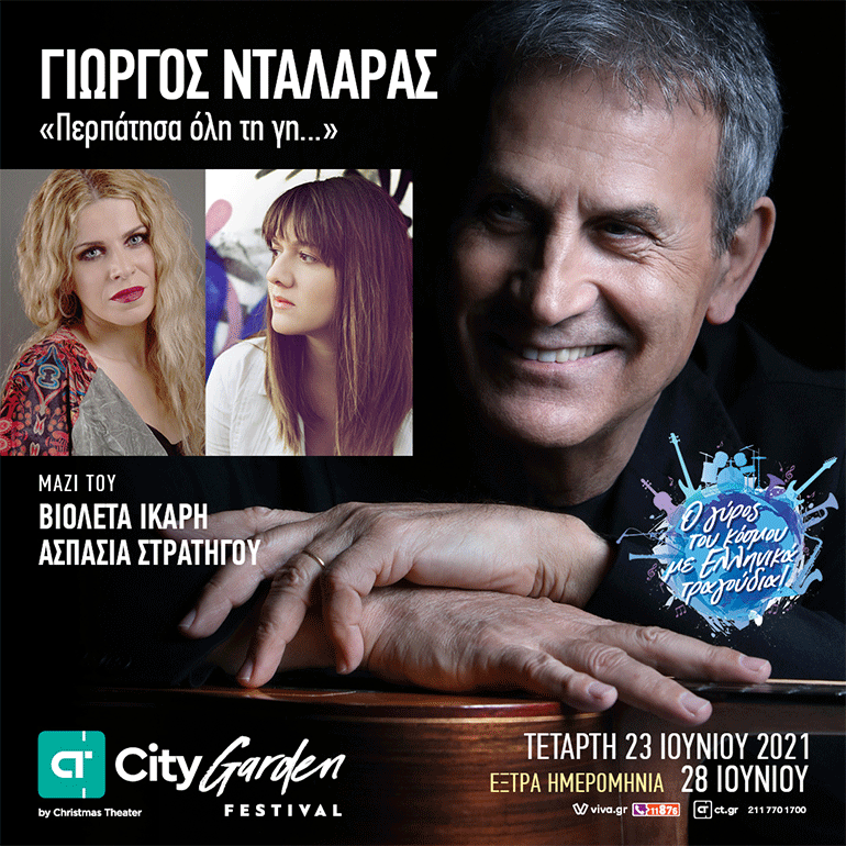 Ένα νέο φεστιβάλ μας καλεί να κάνουμε τον γύρο του κόσμου με ελληνικά τραγούδια. Καταξιωμένοι ερμηνευτές και δημιουργοί του σύγχρονου ελληνικού τραγουδιού, συμμετέχουν σε μία σειρά συναυλιών στο CT Garden Festival, που αντλούν τα θέματα και το υλικό τους από τα πιο ταξιδιάρικα ελληνικά τραγούδια. Κι από κοντά ορχήστρες, συγκροτήματα και κορυφαίοι σολίστες. Στο CT Garden Festival του Christmas Theater συναυλιακά γεγονότα θα μας ταξιδέψουν με ελληνικά τραγούδια σε κάθε γωνιά της Ελλάδας αλλά και σε όλο τον κόσμο από τις 23 Ιουνίου έως τις 23 Ιουλίου 2021.