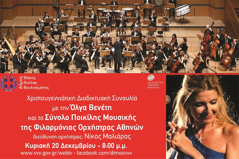 Μία μεγάλη διαδικτυακή Χριστουγεννιάτικη συναυλία που διοργανώνει ο Δήμος Βάρης-Βούλας-Βουλιαγμένης με την αισθαντική φωνή της Όλγας Βενέτη και με τη συμμετοχή του συνόλου ποικίλης μουσικής της Φιλαρμόνιας Ορχήστρας Αθηνών (ΦΟΑ) , υπό τη διεύθυνση του Νίκου Μαλιάρα.