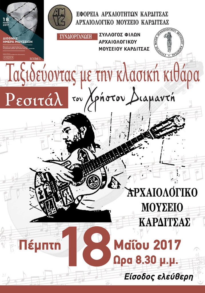 Πρόκειται για ένα ταξίδι στη μουσική με οδηγό τον Χρήστο Διαμαντή και την κλασική του κιθάρα. Στον ατμοσφαιρικό χώρο του Αρχαιολογικού Μουσείου Καρδίτσας, ακολουθούμε τη μουσική διαδρομή από την Αναγέννηση έως τον 20ο αιώνα και από τον ρομαντισμό ως το ελληνικό τραγούδι, με τον Χρήστο Διαμαντή να μας δείχνει τον δρόμο της ευαισθησίας, της απλότητας και της ομορφιάς, με την βοήθεια πολύ καλών φίλων και εξαιρετικών μουσικών.