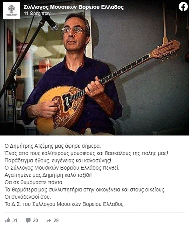 Σε ανάρτησή του στα κοινωνικά δίκτυα, ο Σύλλογος Μουσικών Βορείου Ελλάδος έγραψε: «Ο Δημήτρης Ατζέμης μας άφησε σήμερα. Ένας από τους καλύτερους μουσικούς και δασκάλους της πόλης μας! Παράδειγμα ήθους, ευγένειας και καλοσύνης! Ο Σύλλογος Μουσικών Βορείου Ελλάδος πενθεί. Αγαπημένε μας Δημήτρη καλό ταξίδι! Θα σε θυμόμαστε πάντα. Τα θερμότερά μας συλλυπητήρια στην οικογένεια και στους οικείους. Οι συνάδελφοί σου».