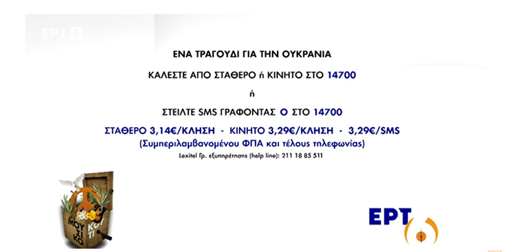 Η έκκληση των 40 και πλέον καλλιτεχνών, που έδωσαν το παρών στο κάλεσμα της ΕΡΤ και του «Μουσικού Κουτιού», για οικονομική στήριξη του ουκρανικού λαού,ξεπέρασε έως το μεσημέρι της Τρίτης 5 Απριλίου, τις 230.000 ευρώ.