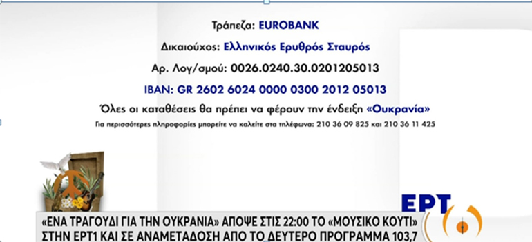 Εάν κάποιος επιθυμεί  να προσφέρει μεγαλύτερο ποσό μπορεί να κάνει κατάθεση στον επίσημο τραπεζικό λογαριασμό του Ελληνικού Ερυθρού Σταυρού, που αναφέρεται παρακάτω. Ο Ελληνικός Ερυθρός Σταυρός στη συνέχεια θα διαθέσει το σύνολο του ποσού στον Ουκρανικό Ερυθρό Σταυρό, για τη στήριξη του ανθρωπιστικού του έργου.