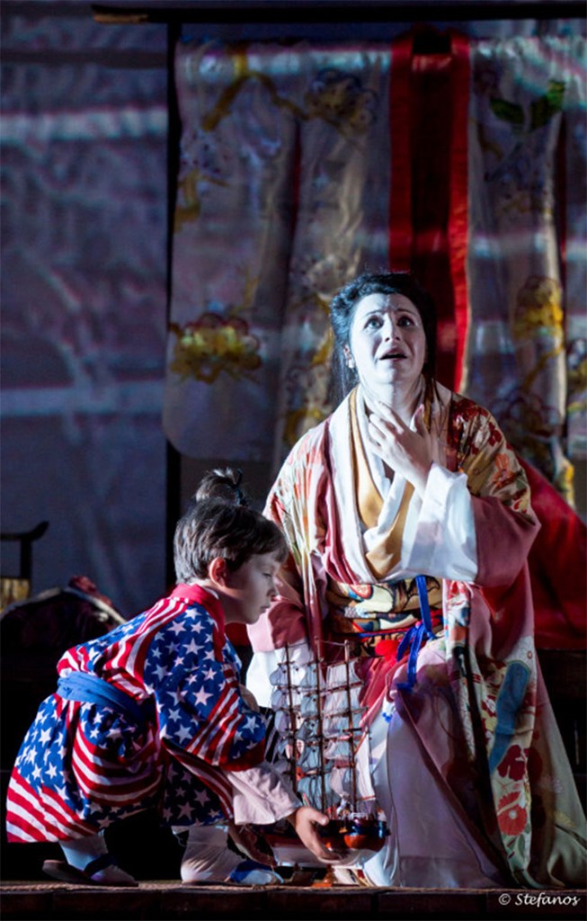 Η παραγωγή υλοποιείται με τη στήριξη της δωρεάς του Ιδρύματος Σταύρος Νιάρχος (ΙΣΝ) για την ενίσχυση της καλλιτεχνικής εξωστρέφειας της Εθνικής Λυρικής Σκηνής. Πρόκειται για μια εντυπωσιακή παραγωγή με παραδοσιακά γιαπωνέζικα κοστούμια και σκηνικά, καθώς και προβολές που εικονοποιούν με εντυπωσιακό τρόπο τη χώρα του ανατέλλοντος ηλίου. Στη διανομή συναντούμε σπουδαίους Έλληνες και ξένους πρωταγωνιστές, με κορυφαία τη σοπράνο Ερμονέλα Γιάχο, που έχει χαρακτηριστεί από τον Economist «η πιο φημισμένη σοπράνο στον κόσμο», αλλά και τη διεθνώς καταξιωμένη Κριστίν Όπολαϊς, την οποία το ελληνικό κοινό έχει θαυμάσει πριν δώδεκα χρόνια στον ρόλο της Τόσκας. Η σπουδαία πρωταγωνίστρια της ΕΛΣ Τσέλια Κοστέα θα ερμηνεύσει επίσης τον ομώνυμο ρόλο, ενώ το καστ συμπληρώνουν οι Τζανλούκα Τερρανόβα, Δημήτρης Πακσόγλου, Διονύσης Σούρμπης, Νίκος Κοτενίδης κ.ά.