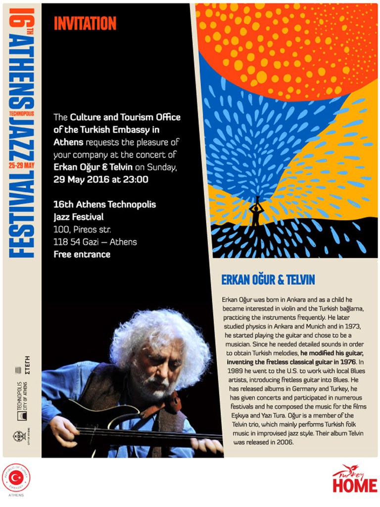 Με τα μαγευτικά ακούσματα της τούρκικης folk μουσικής μέσα από jazz αυτοσχεδιασμούς θα κλείσουν την αυλαία του 16ου φεστιβάλ μουσικής Jazz ο Erkan Oğur και οι Telvin, στην Τεχνόπολη, την Κυριακή 29 Μαΐου στις 23.00.