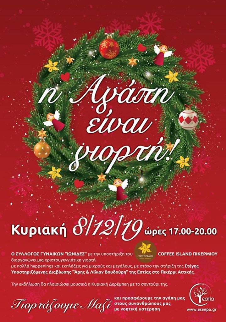 Υπέροχο bazaar με δημιουργίες από μέλη του συλλόγου, γλυκά και τέλειοι καφέδες, θα είναι εκεί για όλους όσοι παραβρεθούν και μετά τις 7μμ οι Ιωνίδες θα προσφέρουν ζεστό κρασί, ώστε με κέφι τραγούδι και χορό, να γίνει πράξη, ότι η Αγάπη είναι Γιορτή!!