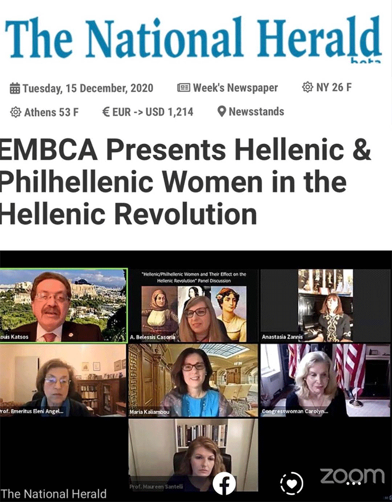Σε ζωντανή διαδικτυακή σύνδεση με τη Νέα Υόρκη η διεθνής σοπράνο Αναστασία Ζαννή τραγούδησε, ενώ στο πάνελ ήταν η εκπρόσωπος του Κονγκρέσου στο Λευκό Οίκο, Κάρολιν Μαλόνεϊ και οι διακεκριμένες: Μαρίνα Μπελέχρη- Καζόρια, αντιπρόεδρος του EMBCA και συντονίστρια του πάνελ, Ελένη Ανγκελομάτις – Τζουγκαράκις, ιστορικός, η Μαρία Καλιάμπρου, καθηγήτρια στο πανεπιστήμιο Γέιλ και η επίσης ιστορικός Μορύν Κόνορς- Σαντέλη. Θέμα της συζήτησης ήταν «Η συμβολή των Γυναικών στην Ελληνική Επανάσταση του ’21».