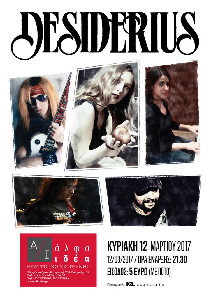 Οι Desiderius, Κατερίνα Βολίκα (the troublemaker) φωνή, ο Stevie Sinner και ο George Haniotakis (ηλεκτρική κιθάρα), ο Πάρης Μπρεγιάννης (κρουστά), ο Michael Starr και η Χριστίνα Παπανδρέου (πλήκτρα), θα παρουσιάσουν στο Θέατρο Άλφα.Ιδέα, την Κυριακή 12 Μαρτίου και ώρα 21.30, μουσικά ακούσματα από το Βορρά (Φινλανδίας, Ολλανδίας κ.α.).