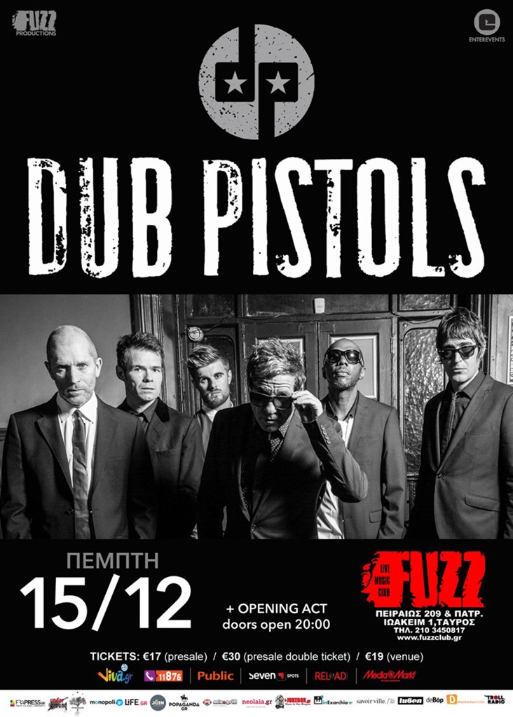 Οι Dub Pistols επιστρέφουν στην Αθήνα! Το εκρηκτικό Βρετανικό dub – big beat – ska-punk σχήμα του Barry Ashworth, το οποίο φέτος συμπληρώνει 20 χρόνια δυναμικής παρουσίας στην παγκόσμια μουσική σκηνή, θα βρίσκεται για μία και μοναδική εμφάνιση την Πέμπτη 15 Δεκεμβρίου στο Fuzz Live Music Club!