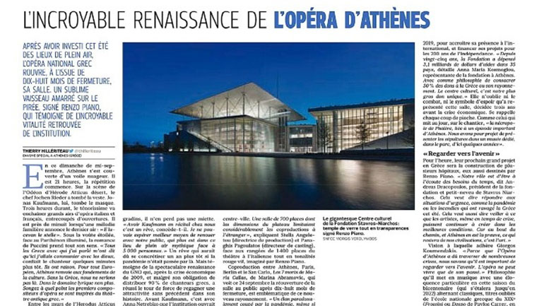 Με ένα μεγάλο αφιέρωμα στην Εθνική Λυρική Σκηνή (ΕΛΣ) κυκλοφορεί το σημερινό φύλλο της γαλλικής εφημερίδας Le Figaro. H Le Figaro είναι η παλιότερη γαλλική εφημερίδα και σήμερα είναι η δεύτερη σε κυκλοφορία σε όλη τη Γαλλία. Ο δημοσιογράφος της εφημερίδας Thierry Hillériteau επισκέφθηκε τις εγκαταστάσεις της ΕΛΣ στην Αθήνα και μίλησε, μεταξύ άλλων, με τον καλλιτεχνικό διευθυντή της ΕΛΣ, Γιώργο Κουμεντάκη, τον πρόεδρο του Ιδρύματος Σταύρος Νιάρχος (ΙΣΝ), Ανδρέα Δρακόπουλο και τον διακεκριμένο τενόρο, Γιόνας Κάουφμαν λίγο πριν το ρεσιτάλ του στο Ηρώδειο.