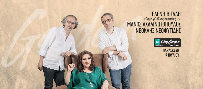 Η Ελένη Βιτάλη έρχεται στο CT Garden Festival, με δύο πολυσχιδείς μουσικούς. Τον πιανίστα Νεοκλή Νεοφυτίδη και τον δεξιοτέχνη του κλαρίνου Μάνο Αχαλινωτόπουλο, μουσικούς που το καλλιτεχνικό τους μέγεθος δεν περιγράφεται με τους κοινούς όρους.