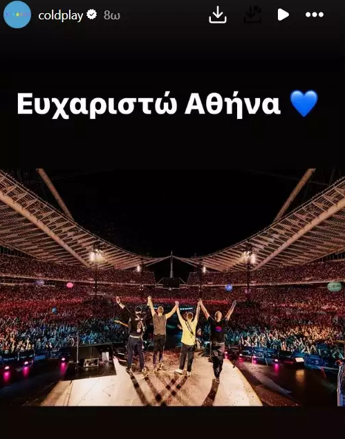 Μετά το τέλος της συναυλίας, οι Coldplay ευχαρίστησαν τους θαυμαστές τους, ανεβάζοντας στον προσωπικό τους λογαριασμό στο Instagram ένα μήνυμα στα ελληνικά.