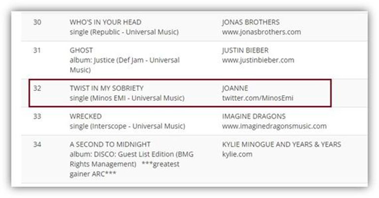Το ντεμπούτο hit της Joanne «Twist In My Sobriety» -η διασκευή του θρυλικού τραγουδιού της Tanita Tikaram-, μετά τη σαρωτική του πορεία στο Greek Airplay Chart (Top 10 εδώ και 4 συνεχόμενες εβδομάδες), ακούγεται δυνατά και στην Κροατία! Πιο συγκεκριμένα, το single της Joanne βρίσκεται στη θέση Νο 32 του επίσημου airplay chart με ανοδική πορεία, ενώ στο Shazam Chart της χώρας το συναντάμε τις τελευταίες μέρες σταθερά στο Top 20.