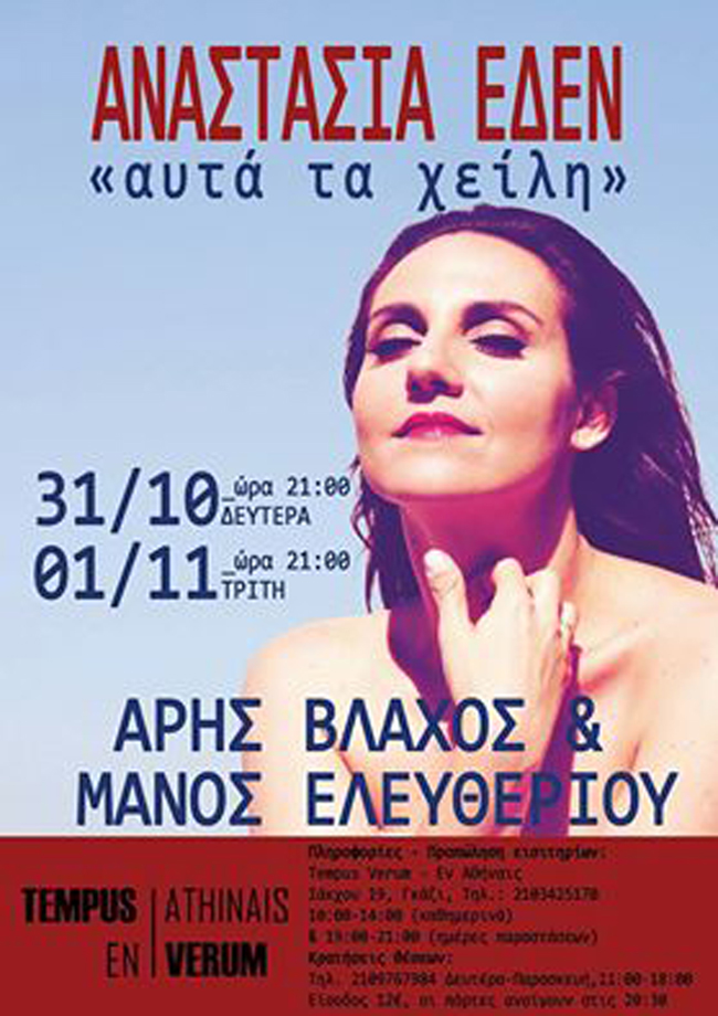 Η Αναστασία Έδεν και ο συνθέτης Άρης Βλάχος παρουσιάζουν στη σκηνή του Tempus Verum την παράσταση «Αυτά τα χείλη». Ένα μουσικό θέαμα με την υπογραφή του πολυσχιδή Μάνου Ελευθερίου, βασισμένο στον έρωτα, την αισθητική και την εναρμόνιση του σύγχρονου με το κλασσικό, του παλιού με το καινούριο.