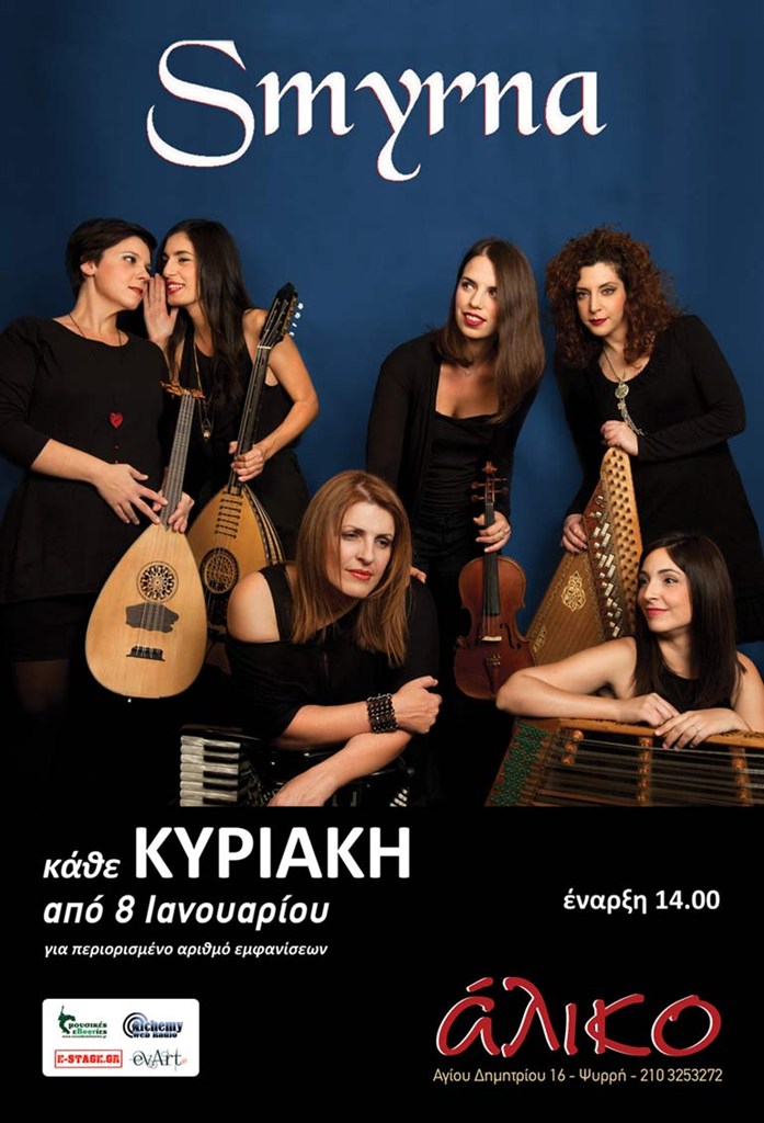 Από τις 8 Ιανουαρίου και κάθε Κυριακή μεσημέρι (για περιορισμένο αριθμό εμφανίσεων), η γυναικεία ορχήστρα Smyrna αρχίζει τις χειμερινές της εμφανίσεις και υποδέχεται τους φίλους της στον πολυχώρο Άλικο σε ένα μουσικό πρόγραμμα γεμάτο μουσικές, χρώματα, αρώματα και γεύσεις από όλο τον ελλαδικό χώρο, με πολύ χορό και τραγούδι.