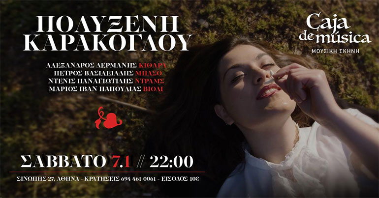 Η Πολυξένη Καράκογλου συνεχίζει τις επιτυχημένες εμφανίσεις και αυτή τη φορά θα εμφανιστεί για πρώτη φορά στο νέο μουσικό στέκι Caja de musica στη Μιχαλακοπούλου, το Σάββατο 7 Ιανουαρίου.