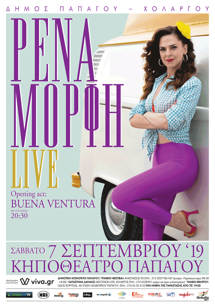 Η Ρένα Μόρφη γύρισε την πρώτη κινηματογραφική της ταινία, έβγαλε το νέο της gran exito/ντουέτο με τον Μάρκο Κούμαρη των Locomondo, πήγε το ταξιδάκι της στη λατινική Αμερική να μαζέψει μουσική, ξεκίνησε την καλοκαιρινή της περιοδεία απ’ άκρη σ’ άκρη της Ελλάδας και επιστρέφει στην Αθήνα για μια δροσερότατη συναυλία στο Κηποθέατρο Παπάγου, το Σάββατο 7 Σεπτεμβρίου 2019.