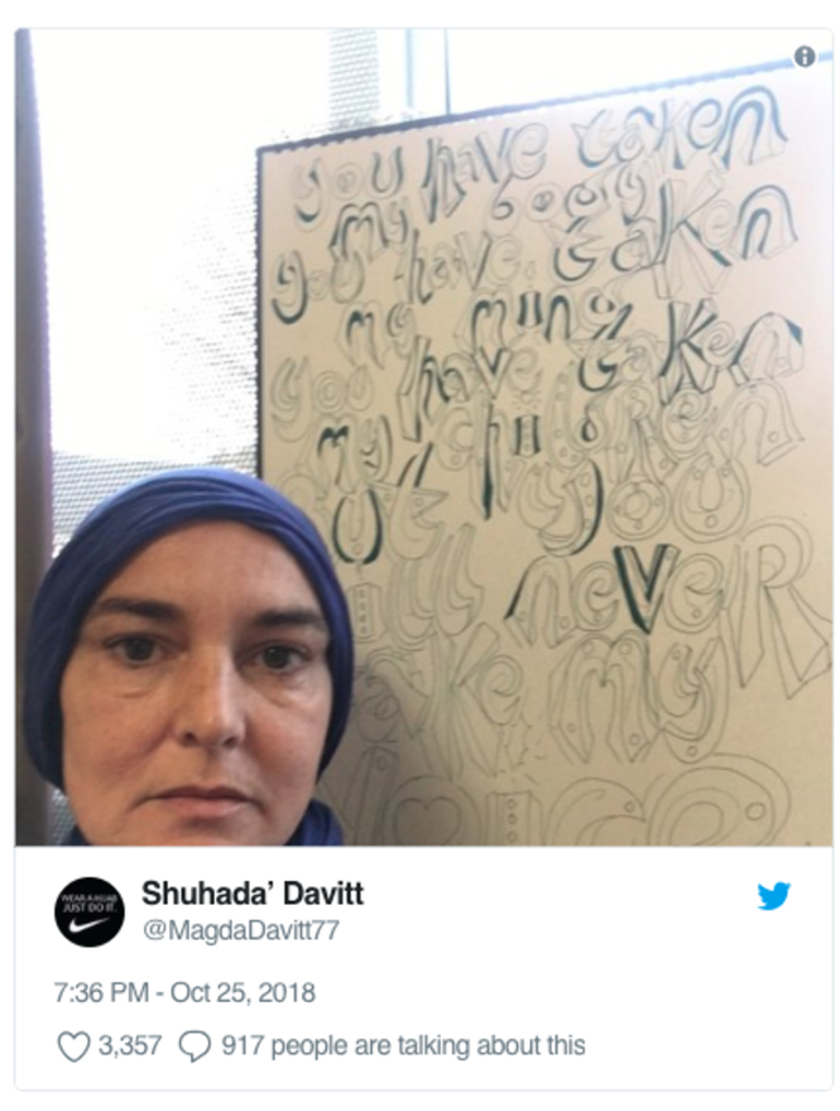 Η διάσημη Ιρλανδέζα τραγουδίστρια Σινέντ Ο’ Κόνορ ανακοίνωσε ότι ασπάστηκε το Ισλάμ και ως εκ τούτου άλλαξε το όνομά της σε Σουχάντα Νταβίτ.