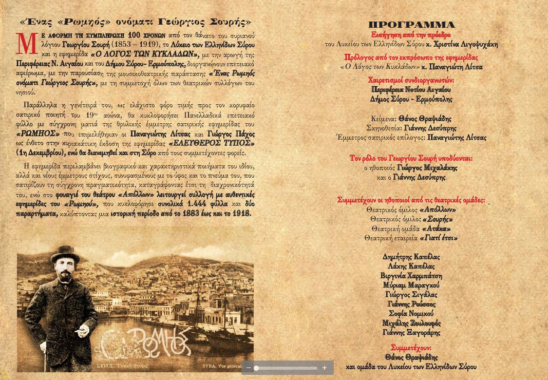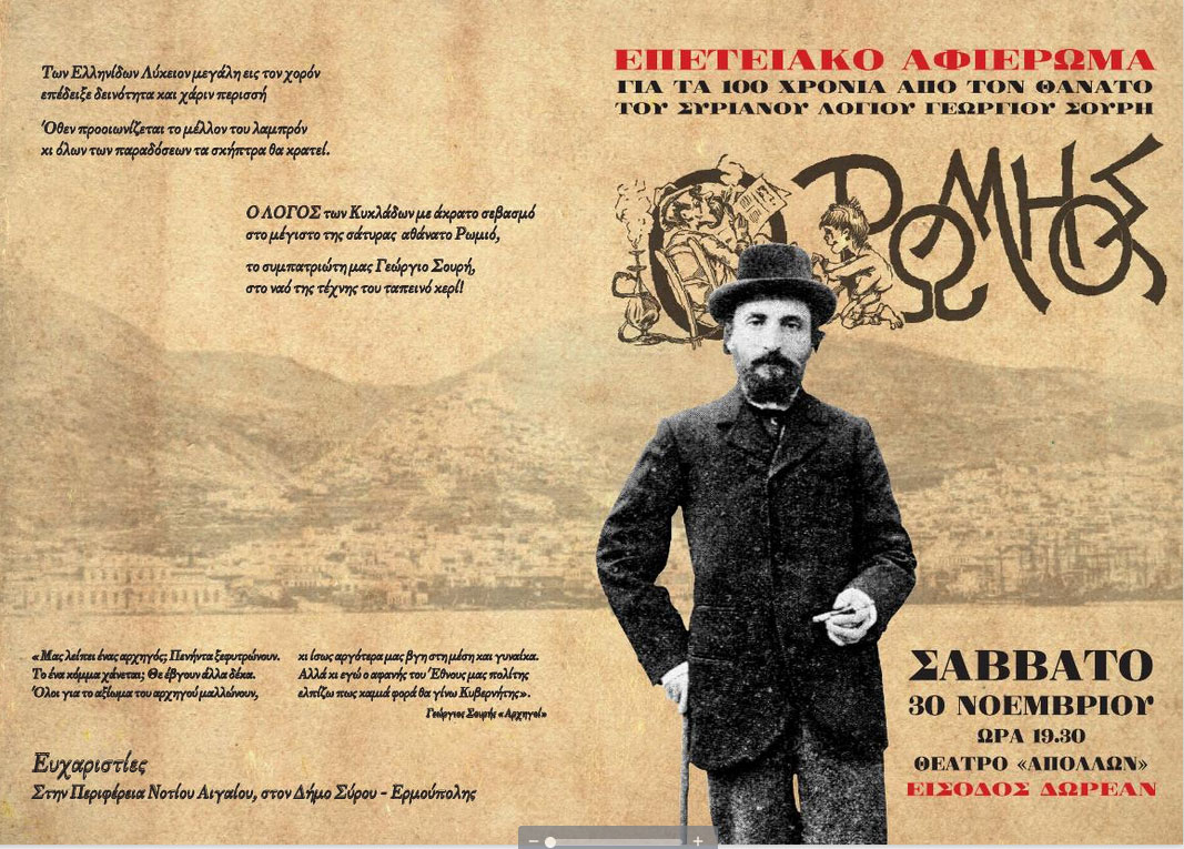 Η Σύρος, με αφορμή τη συμπλήρωση 100 χρόνων από τον θάνατο του λόγιου Γεωργίου Σουρή (1853 – 1919), μέσω του Λυκείου των Ελληνίδων Σύρου και της εφημερίδας «Ο ΛΟΓΟΣ ΤΩΝ ΚΥΚΛΑΔΩΝ», την αρωγή της Περιφέρειας Ν. Αιγαίου και του Δήμου Σύρου – Ερμούπολης, διοργανώνουν επετειακό αφιέρωμα με την παρουσίαση της μουσικοθεατρικής παράστασης «Ένας Ρωμηός ονόματι Γεώργιος Σουρής», το Σάββατο 30 Νοεμβρίου και ώρα 19.30, στο ιστορικό θέατρο «Απόλλων», με τη συμμετοχή όλων των θεατρικών συλλόγων του νησιού σε κείμενα Θάνου Θραψιάδη, σκηνοθεσία Γιάννη Δεσύπρη, έμμετρο σατιρικό επίλογο Παναγιώτη Λίτσα και τη φιλική συμμετοχή του ηθοποιού Γιώργου Μιχαλάκη.