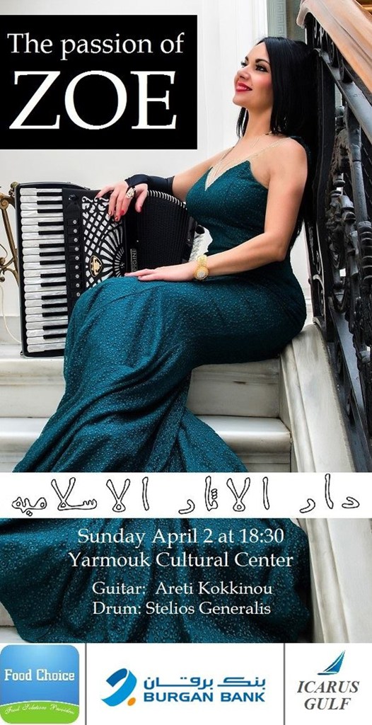 Την Κυριακή 2 Απριλίου, η διακεκριμένη συνθέτις και σολίστ ακορντεόν Ζωή Τηγανούρια θα εμφανιστεί στο θέατρο Yarmouk του Κουβέιτ για να ερμηνεύσει γνωστά κομμάτια από τη προσωπική της δισκογραφία, η οποία αποτελείται από 19 προσωπικά άλμπουμ, εκατοντάδες συμμέτοχες ως συνθέτης και σολίστ στην Ελληνική δισκογραφία, soundtracks και ορχηστρικές συνθέσεις σε διεθνείς συλλογές όπως το Buddha Bar. Επίσης στη παράσταση θα συμπεριλάβει κομμάτια από το πλούσιο Ελληνικό και διεθνές ρεπερτόριό της.