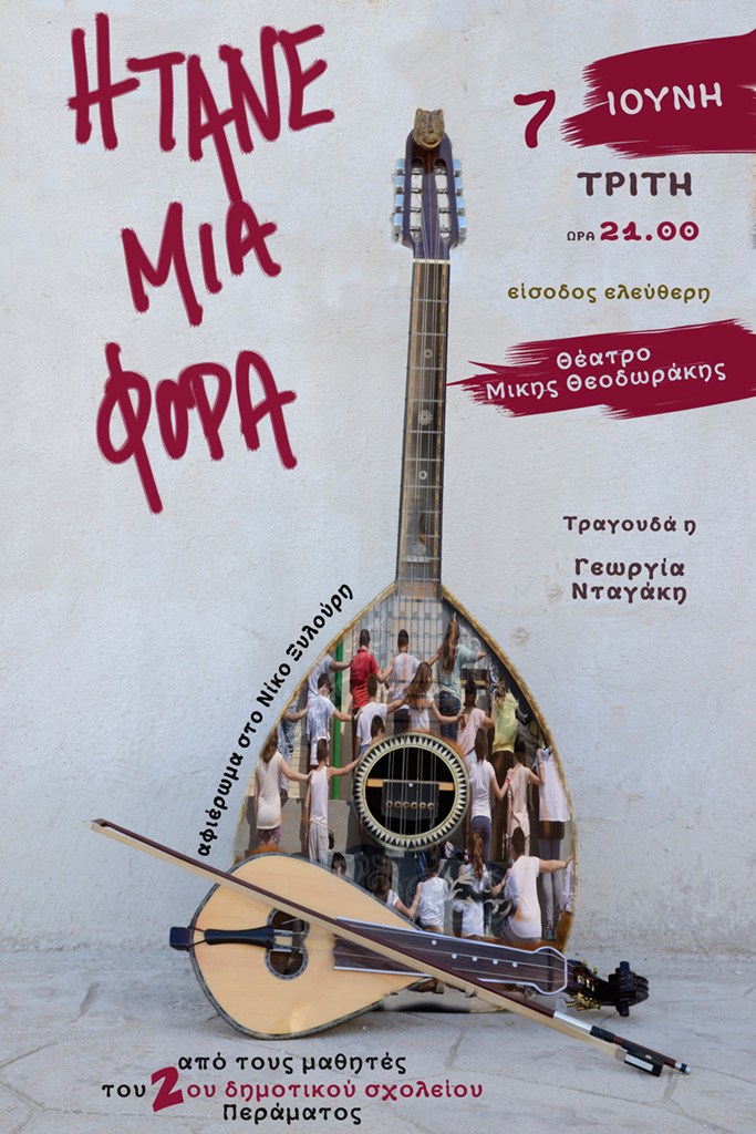 Οι μαθητές του 2ου Δημοτικού Σχολείου Περάματος στο πλαίσιο του αφιερώματος στον Νίκο Ξυλούρη, διοργανώνουν μία μουσική παράσταση στο Ανοιχτό Δημοτικό Θέατρο Περάματος «Μίκης Θεοδωράκης» την Τρίτη 7 Ιουνίου 2016 με τη συμμετοχή της Γεωργίας Νταγάκη.