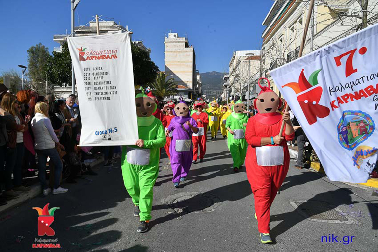 Την Κυριακή 10 Μαρτίου πραγματοποιήθηκε η μεγάλη καρναβαλική παρέλαση του 7ου Καλαματιανού Καρναβαλιού. Ο καλός καιρός και η ζέστη, που θύμιζαν καλοκαίρι στάθηκαν σύμμαχοι και βοήθησαν τον κόσμο να βγει ήδη από πολύ νωρίς, για να κάνει τη βόλτα του και να απολαύσει την παρέλαση των γκρούπ.