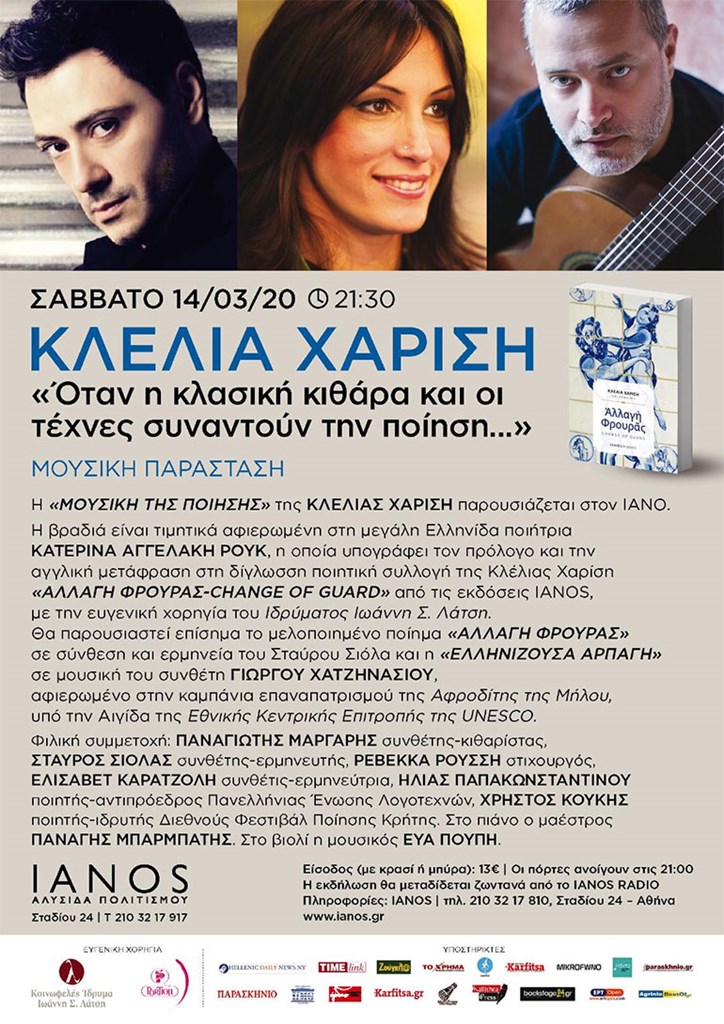 Η βραδιά είναι τιμητικά αφιερωμένη στη μεγάλη Ελληνίδα ποιήτρια Κατερίνα Αγγελάκη Ρουκ, η οποία υπογράφει τον πρόλογο και την αγγλική μετάφραση στη δίγλωσση ποιητική συλλογή της Κλέλιας Χαρίση «Αλλαγή Φρουράς-Change Of Guard» από τις εκδόσεις IANOS, με την ευγενική χορηγία του Ιδρύματος Ιωάννη Σ. Λάτση.