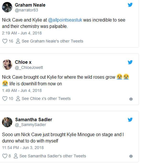 Η Kylie Minogue αιφνιδίασε το κοινό μουσικού φεστιβάλ του Λονδίνου ανεβαίνοντας πάνω στη σκηνή μαζί με τον Nick Cave και τους The Bad Seeds για να τραγουδήσουν εκ νέου μαζί του τη μεγάλη τους επιτυχία από το μακρινό 1995 με το «Where The Wild Roses Grow».