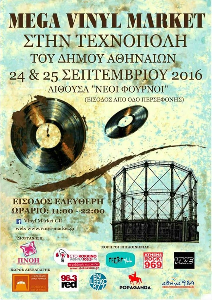 Το Mega Vinyl Market, μετά το επιτυχημένο event του Απριλίου, έρχεται τον Σεπτέμβριο, ξανά στην Τεχνόπολη του Δήμου Αθηναίων. Το Σάββατο 24 και την Κυριακή 25 Σεπτεμβρίου, μια μεγάλη εκδήλωση αποκλειστικά για το βινύλιο, που σκοπό έχει να το αναδείξει, αλλά ταυτόχρονα, να γνωρίσει στο κοινό, τους ανθρώπους που ασχολούνται με αυτό, πού μπορεί να τους βρει και σε τι είδος μουσικής ειδικεύεται ο καθένας. Εκεί θα βρίσκονται πάνω από 60 περίπτερα με δίσκους βινυλίου, στα οποία θα συμμετέχουν όλα τα καταστήματα δίσκων της πόλης, δισκογραφικές εταιρείες και πολλοί ιδιώτες με πλούσιες συλλογές απ’ όλη την γκάμα της μουσικής βιομηχανίας.