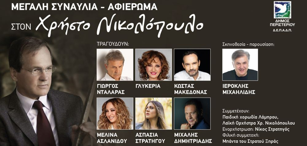 Ο Δήμος Περιστερίου διοργανώνει μεγάλη συναυλία – αφιέρωμα στον Χρήστο Νικολόπουλο, την Τετάρτη 12 Ιουλίου 2023, ώρα 20:30, στο Άλσος Περιστερίου – στάση Μετρό «Ανθούπολη».
