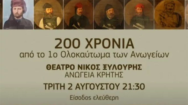 Τα Ανώγεια στις 2 Αυγούστου 2022 και ώρα 21:15, στο Θέατρο Νίκος Ξυλούρης, γιορτάζουν την επέτειο των 200 χρόνων από το 1ο Ολοκαύτωμα από τους Τούρκους, το 1822, και η μουσική θα ανάψει το διακόπτη για το φως της μνήμης… Δίπλα στους μουσικούς των Συνόλων της ΕΡΤ της Ορχήστρας Σύγχρονης Μουσικής θα σταθούν οι Βασίλης Σκουλάς, Ψαραντώνης, Μιχάλης Καλλέργης, Γιώργης Βρέντζος, Νίκη Ξυλούρη, Βασίλης Δραμουντάνης, Μαρίνα Δακανάλη, Νικόλας Καράτζης και ο Λουδοβίκος των Ανωγείων.
