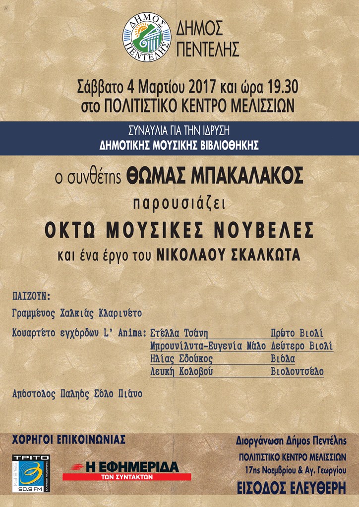 Ο συνθέτης Θωμάς Μπακαλάκος δίνει την πρώτη συναυλία, με σκοπό την ίδρυση Δημοτικών Μουσικών Βιβλιοθηκών στην Αττική και σε όλη τη χώρα, ξεκινώντας από το δήμο Πεντέλης.