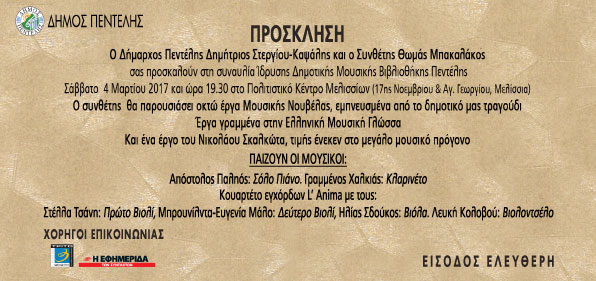Η συναυλία θα γίνει στο Πολιτιστικό Κέντρο Μελισσίων του δήμου Πεντέλης, στις 4 Μαρτίου και ώρα 7.30. Είσοδος ελεύθερη.
