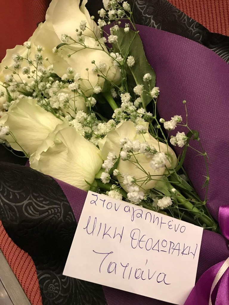 Ιδιαίτερη στιγμή της βραδιάς η ανθοδέσμη που άφησε στη σειρά 17, θέση 1, -όπου συνήθιζε να κάθεται ο Μίκης Θεοδωράκης- με το χειρόγραφο «στον αγαπημένο μου Μίκη Θεοδωράκη, Τατιάνα».