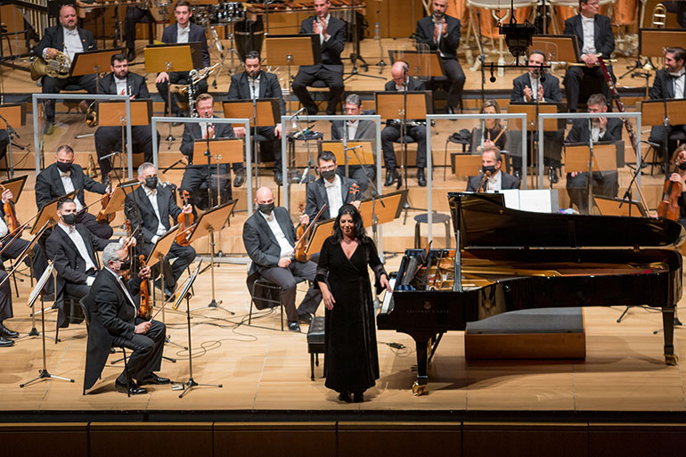 Μεγαλειώδης η συναυλία στο Μέγαρο Μουσικής Αθηνών με τη Σουίτα αρ.1 του Μίκη Θεοδωράκη, που δόθηκε την Παρασκευή 12 Νοεμβρίου 2021 από την Κρατική Ορχήστρα Αθηνών με σολίστ την πιανίστα Τατιάνα Παπαγεωργίου.