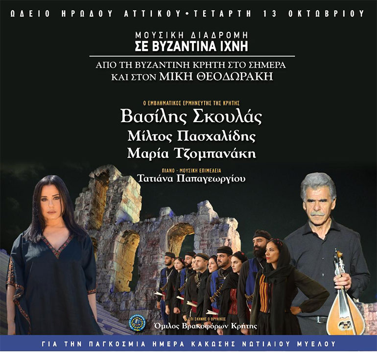 Η συναυλία θα μας ταξιδέψει μέσα από μουσικές σύγχρονων συνθετών με επίκεντρο το μεγαλειώδες έργο του Μίκη Θεοδωράκη, εμπνευσμένο από τη βυζαντινή μουσική παράδοση και τη μουσική και πνευματική κληρονομιά της Κρήτης. Είναι άλλωστε ιστορικά τεκμηριωμένη η σύνδεση της βυζαντινής μελοποιίας με την παραδοσιακή μουσική της Κρήτης, δεδομένου ότι η μεγαλόνησος βρέθηκε υπό βυζαντινή εξουσία για πολλούς αιώνες κατά το μεσαίωνα. Επιπλέον υπήρξε ένα σημαντικό κέντρο χριστιανισμού και καλλιέργειας της βυζαντινής ψαλμωδίας η οποία τροφοδότησε την παραδοσιακή μουσική, ειδικά το ριζίτικο τραγούδι.