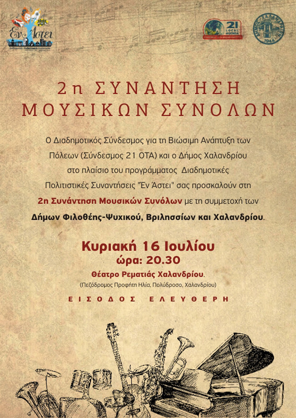 Ο Σύνδεσμος για τη Βιώσιμη Ανάπτυξη των Πόλεων, στο πλαίσιο των Διαδημοτικών Πολιτιστικών Συναντήσεων «Έν Άστει» που υλοποιεί εδώ και έναν χρόνο σε συνεργασία με τους Δήμους – Μέλη του, διοργανώνει τη 2η Συνάντηση Μουσικών Συνόλων.
