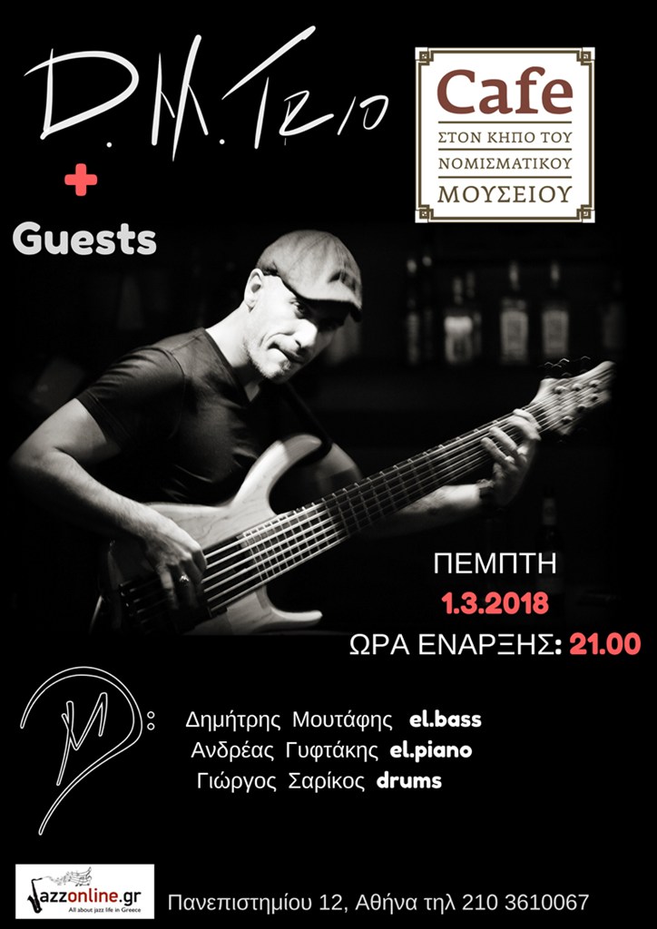 Η άνοιξη μπαίνει στο café του Νομισματικού Μουσείου με το DM trio. Ο παλιός μας γνώριμος και γνωστός μουσικός, Δημήτρης Μουτάφης με το ηλεκτρικό του μπάσο, παρέα με τον Ανδρέα Γυφτάκη στο ηλεκτρικό πιάνο και τον Γιώργο Σαρίκο στα ντραμς, θα μας παρουσιάσουν original κομμάτια και διασκευές. Στα plus της βραδιάς θα είναι η Πέγκυ Ζάρρου που θα ερμηνεύσει επιλεγμένα κομμάτια. Τους περιμένουμε την 1η του Μάρτη, στις 9 μ.μ.