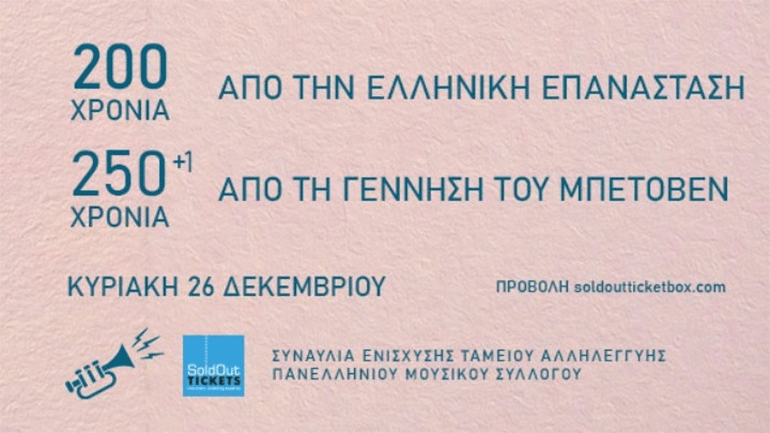 Ο Πανελλήνιος Μουσικός Σύλλογος διοργανώνει την Κυριακή 26 Δεκεμβρίου συναυλία-αφιέρωμα στα 250+1 χρόνια από τη γέννηση του L.V. Beethoven και στα 200 χρόνια από την Ελληνική Επανάσταση. Όπως σημειώνει η σχετική ανακοίνωση, πρόκειται για «μια παραγωγή που έχει σκοπό την ενίσχυση του ταμείου αλληλεγγύης του Συλλόγου, ένα ταμείο που στήριξε και στηρίζει όσους μουσικούς έχουν ανάγκη σε αυτές τις δύσκολες στιγμές που περνά ο κλάδος μας».
