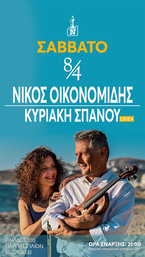 Το Ναργιλέ στο Ίλιον φιλοξενεί ένα μοναδικό νησιώτικο γλέντι το Σάββατο 8 Απριλίου στις 21:00 με τον Νίκο Οικονομίδη και την Κυριακή Σπανού. Οι δύο καλλιτέχνες σας υπόσχονται ένα άκρως χορευτικό live με πολύ κέφι και όρεξη, γεμάτο χρώματα και αρώματα.