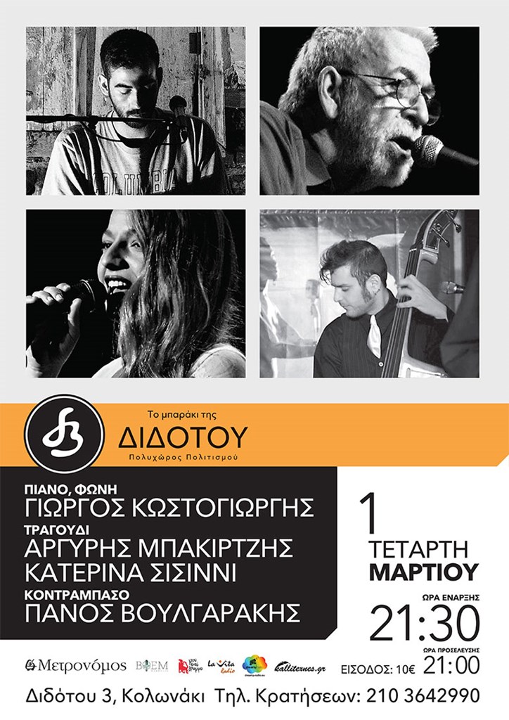 Θα τους απολαύσουμε στο ανανεωμένο Το Μπαράκι της Διδότου – Πολυχώρος Πολιτισμού την Τετάρτη 1 Μαρτίου στις 21:30,, με τη συνδρομή του περιοδικού Μετρονόμος