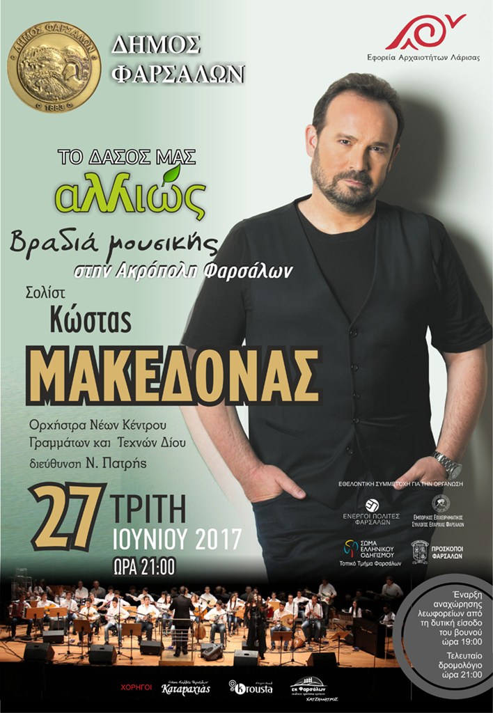Στη μουσική εκδήλωση θα συμμετέχει ο Κώστας Μακεδόνας, και η Ορχήστρα Νέων Κέντρου Γραμμάτων και Τεχνών Δίου.