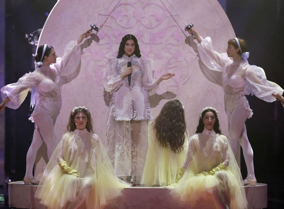 Με ένα λευκό φόρεμα με λεπτομέρειες από τούλι και δαντέλα των Deux Hommes που μας ταξιδεύει στην Αναγέννηση, η ελληνική συμμετοχή άλλαξε από παλ τόνους του μοβ σε πιο έντονα ροζ-ματζέντα χρώματα, την ώρα που οι κοπέλες που πλαισιώνουν την Κατερίνα Ντούσκα ξιφομάχησαν και επιδόθηκαν σε ρυθμική γυμναστική με κορδέλες.