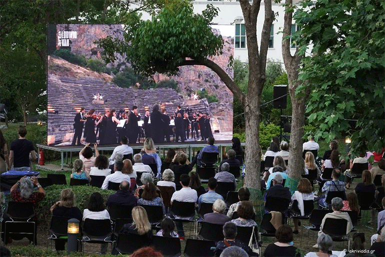 Οι γιγαντοοθόνες μετέφεραν την κατανυκτική ατμόσφαιρα των Δελφών ενώ το παρών στον Κήπο του Μεγάρου έδωσαν μεταξύ άλλων, η Υπουργός Πολιτισμού Λίνα Μενδώνη, η Άντζελα Γκερέκου, ο Γιώργος Κουμεντάκης.
