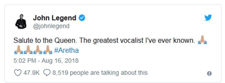 Πωλ ΜακΚάρτνευ: «Ας σταθούμε όλοι για μια στιγμή για να τιμήσουμε την ονειρεμένη ζωή της Αρίθα Φράνκλιν, τη βασίλισσα της ψυχής μας, που μας ενέπνευσε για πολλά-πολλά χρόνια. Θα μας λείψει αλλά η ανάμνηση του μεγαλείου της ως μουσικού και ως ανθρώπου θα ζει μαζί μας για πάντα. Με αγάπη Πώλ»