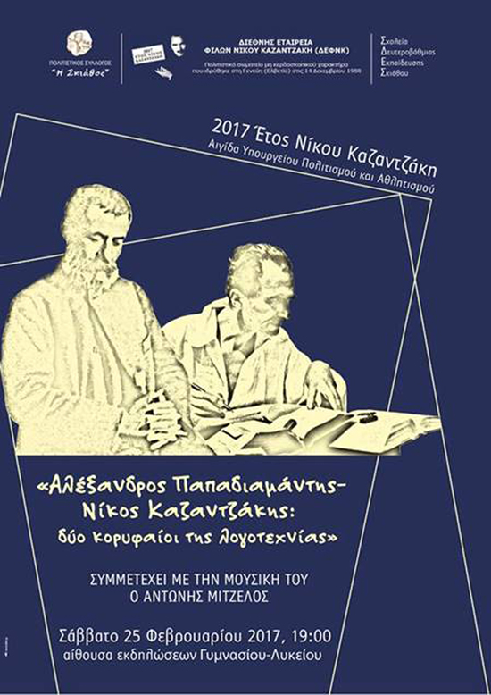 Ο Πολιτιστικός Σύλλογος «Η Σκιάθος» και η Διεθνής Εταιρεία Φίλων Νίκου Καζαντζάκη με έδρα τη Γενεύη, διοργανώνουν την εκδήλωση «Αλέξανδρος Παπαδιαμάντης – Νίκος Καζαντζάκης, δύο κορυφαίοι της λογοτεχνίας» με αφορμή τη συμπλήρωση των 60 χρόνων από το θάνατο του Νίκου Καζαντζάκη.