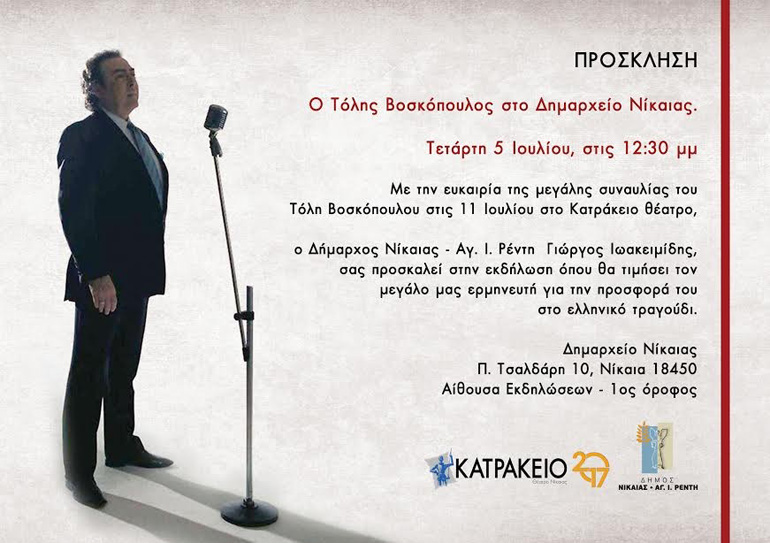 Με την ευκαιρία της μεγάλης συναυλίας του Τόλη Βοσκόπουλου στις 11 Ιουλίου στο Κατράκειο Θέατρο, ο Δήμαρχος Νίκαιας- Αγ. Ι. Ρέντη Γιώργος Ιωακειμίδης, σας προσκαλεί στην εκδήλωση όπου θα τιμήσει τον μεγάλο μας ερμηνευτή για την προσφορά του στο Ελληνικό Τραγούδι την Τετάρτη 5 Ιουλίου, στις 12.30μ.μ.