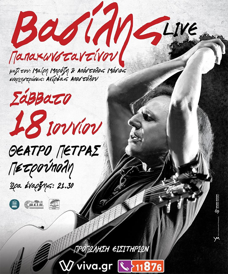 Το Σάββατο 18 Ιουνίου ο Βασίλης Παπακωνσταντίνου θα μας χαρίσει μια μοναδική συναυλία στο Θέατρο Πέτρας στην Πετρούπολη. Θα βουτήξει για χάρη μας στην ατέλειωτη δισκογραφία του και θα διαλέξει να μας τραγουδήσει τα «διαμάντια», τα τραγούδια «σταθμούς» και όλα τα αγαπημένα του/μας.